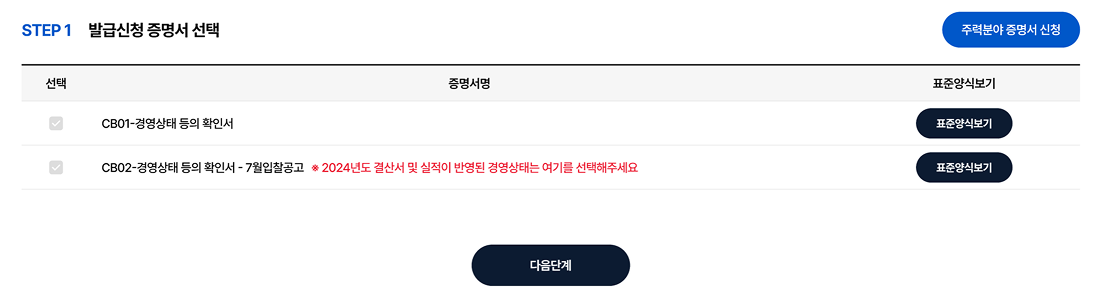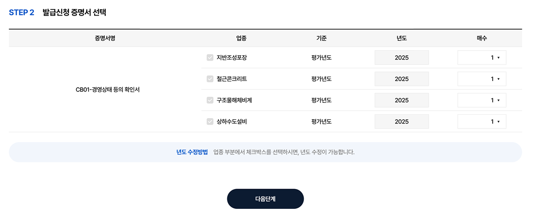 2. 발급을 원하는 증명서를 선택한 후 필요한 업종, 실적/평가년도, 발급부수 등 정보를 입력한다